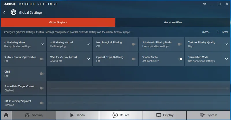 Here are the global graphics settings in AMD’s Crimson ReLive control panel that we use. We used WattMan to set the Power, fan, and temperature limits to their maximums.