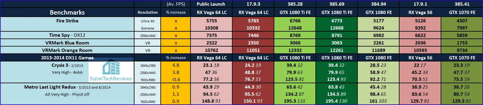 We note some very good performance improvements for the RX Vega 64 with the latest 17.9.3 drivers. And we have noticed generally more stability with the new drivers. Most of the decreases have been minor and some of these may be attributed to benching “noise” (margin of error) or to rebalancing Vega performance by the Radeon Group’s driver team. There has been some gain in performance by the RX Vega 64 LC over the GTX 1080, although we have not tested the very latest GeForce driver using it – only the GTX 1080 Ti, but the overall ranking hasn’t changed by much with the new Crimson ReLive driver.