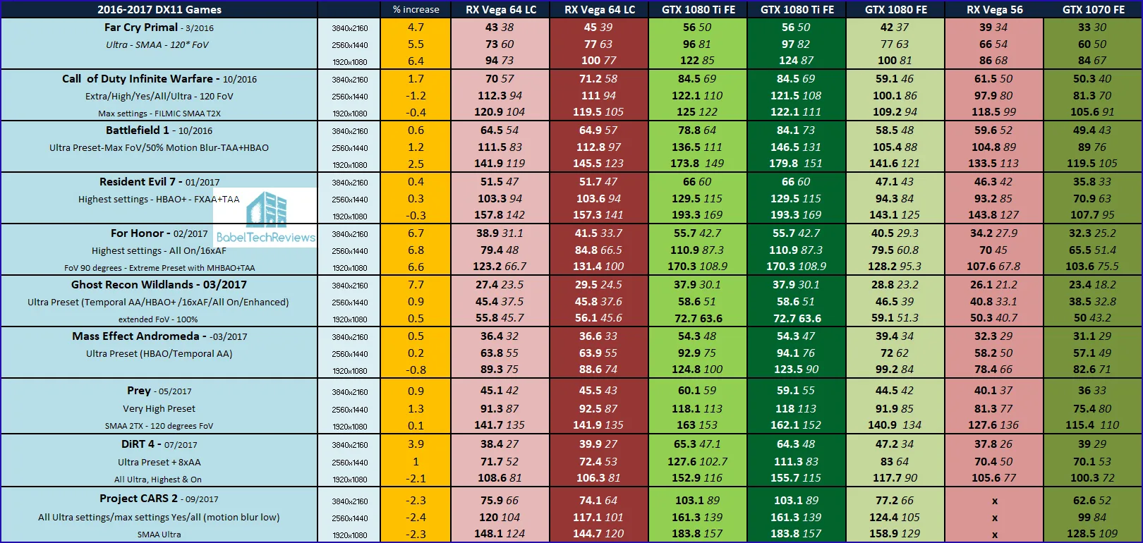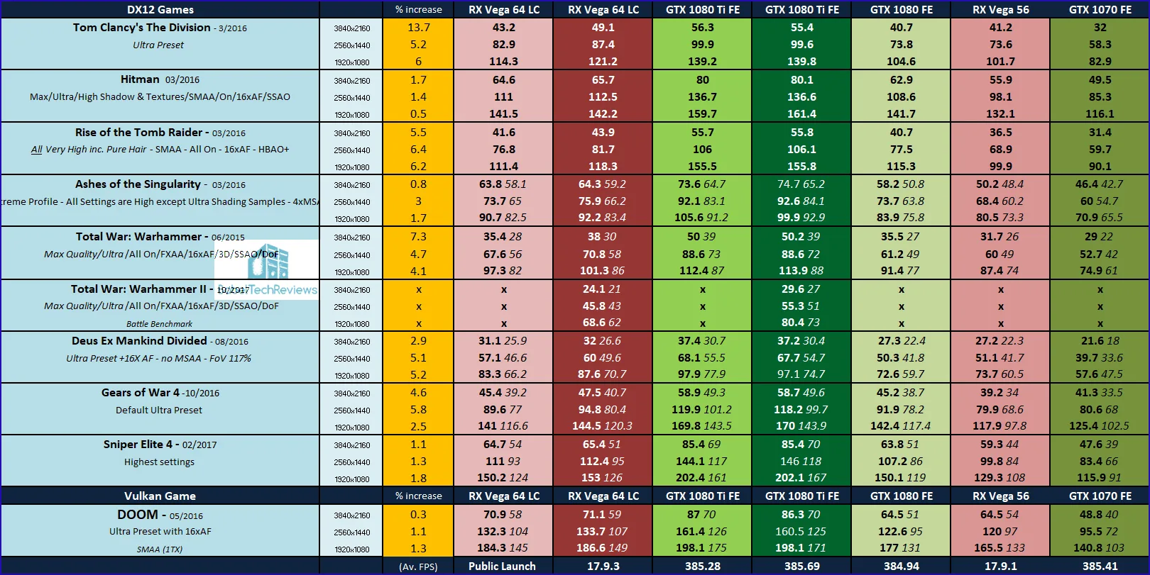 We also feature our newest 2017 DX11 games, Project CAR 2 and DiRT 4, and we are also including the newly released Total War: Warhammer II’s DX12 built-in “Battle'” benchmark to our regular benching suite. We will compare the performance of 30 modern games at 1920×1080, 2560×1440, and at 3840×2160 resolutions with maximum settings.