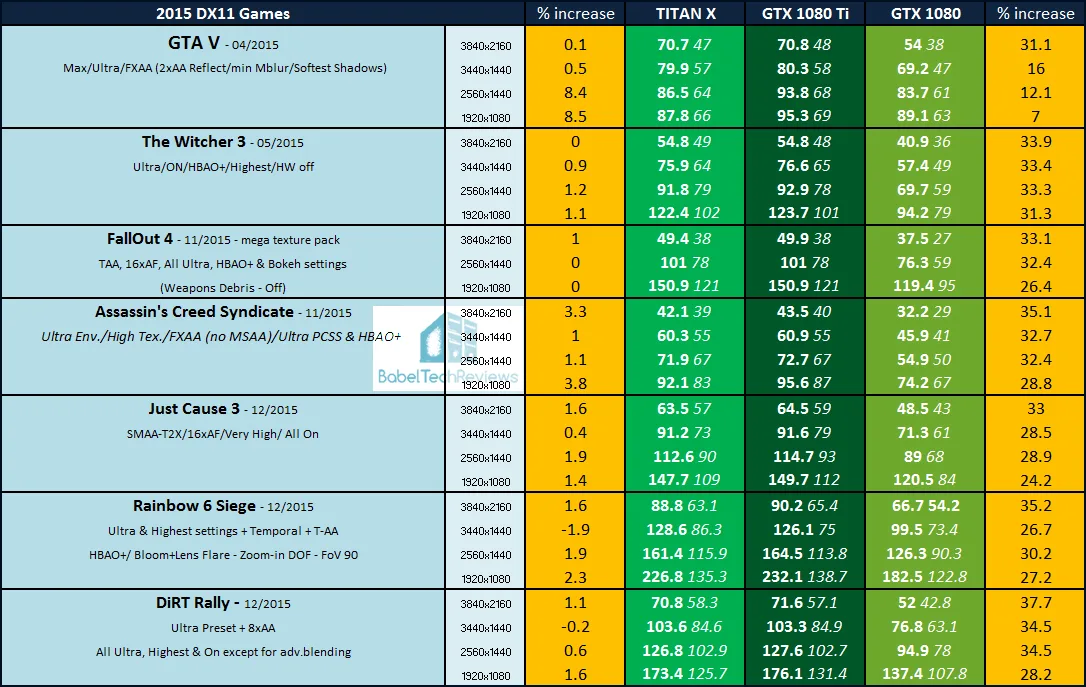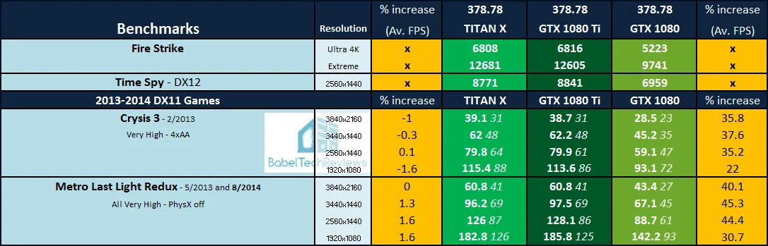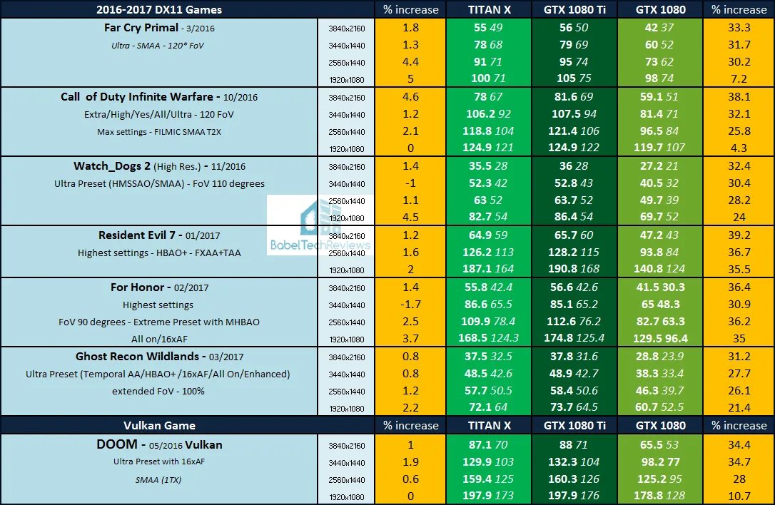 The first green column is devoted to the TITAN X results with the GTX 1080 Ti results compared in Green column 2. The GTX 1080 results are given in the third green column. The first yellow column shows the percentage increase (or decrease) of the GTX 1080 Ti over the Titan X and the last yellow column shows the percentage increase of the GTX 1080 Ti over the GTX 1080.