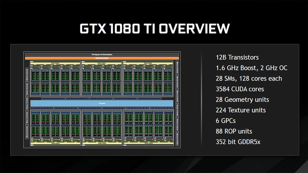 To produce the GTX 1080 Ti variant of the TITAN X, its 12GB of GDDR5X was cut to 11GB so the memory interface has also dropped, from 384-bit to 352-bit. In addition, the Ti’s ROP count is down from 96 to 88 and 256K of the Titan X Pascal’s L2 cache is gone.