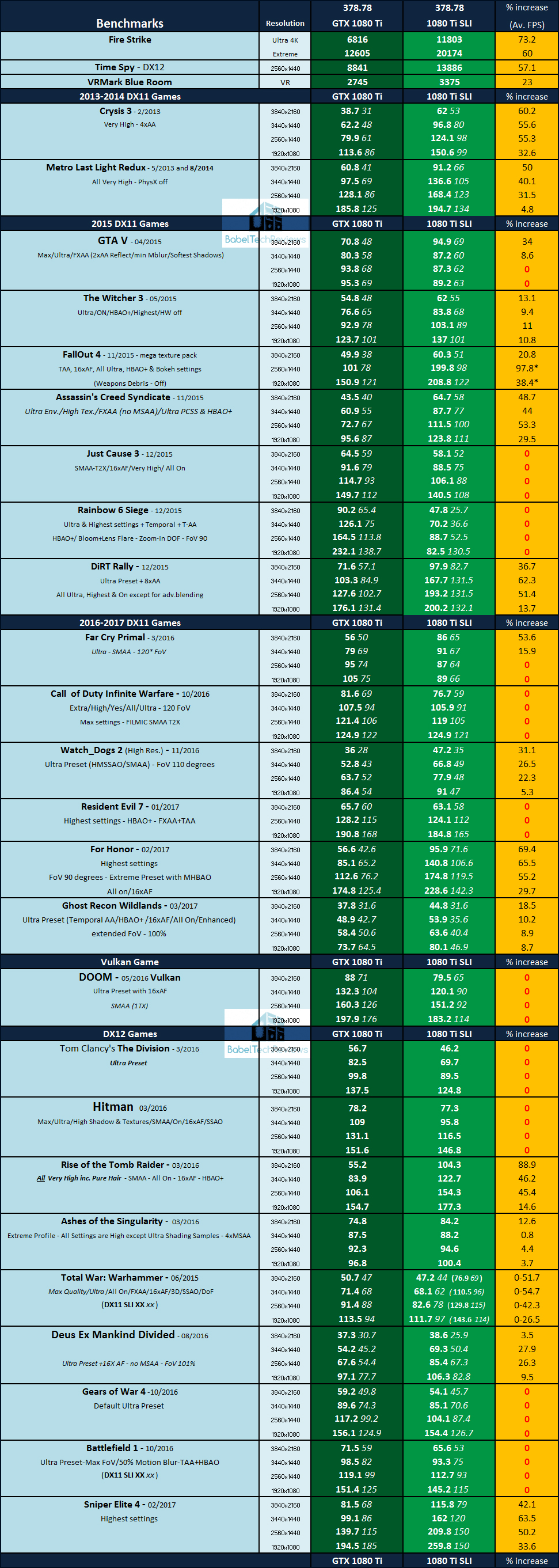 There are two methods of calculating percentages. One is the “Percentage Difference” that we originally used to compare the GTX 1080 versus the TITAN X, and the other is “Percentage Change” which we are using now to show the performance increase of GTX 1080 Ti SLI over a single GTX 1080.