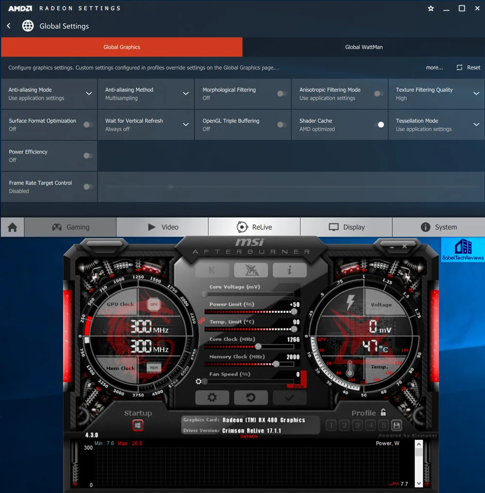 We used the latest ReLive 17.4.1 drivers with these settings and used MSI’s Afterburner to lock the boost clocks to reference as well as set the power limit and temperature sliders to their maximums.