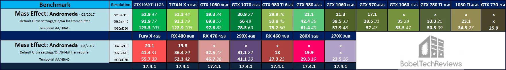 A GTX 1080 Ti can max out Mass Effect: Andromeda at the default Ultra settings at 3840×1080 if you don’t mind framerate dips into the upper 40s. A GTX 1080 at the same settings and resolution can generally stay in the upper to mid-30 FPS range, while a GTX 1060 needs to be at 1920×1080 to stay in the upper 50s FPS for averages. A Fury X appears to be limited by its 4GB of vRAM as it has lower minimums than an 8GB RX 480.