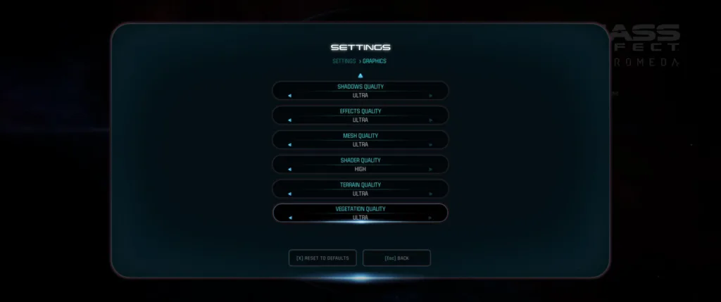 Mass Effect: Andromeda has overall Low, Medium, High, and Ultra settings. Ultra settings allow you to choose your resolution and there is further customization possible – either to lower settings or to increase 3 settings beyond default Ultra where Lighting and Effects are on High, but may be increased to Ultra, and “Full HBAO” is possible at a significant performance hit.