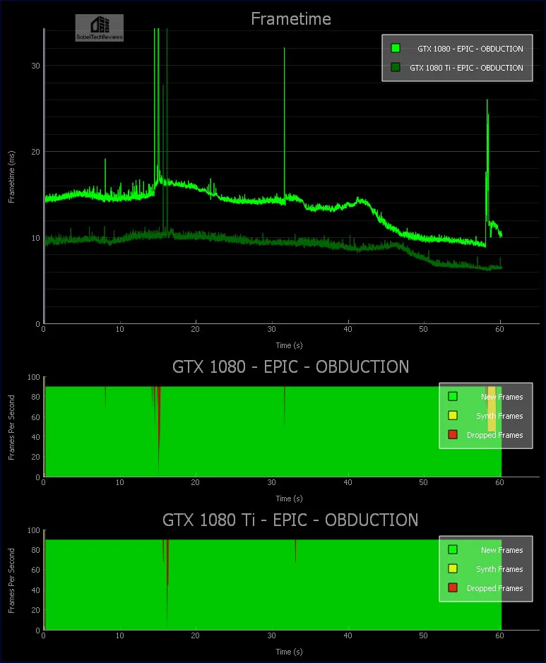 Let’s start with FCAT VR frametimes of Obduction running at Epic settings with the only two cards in our test bench that can manage them – the GTX 1080 Ti and the GTX 1080: