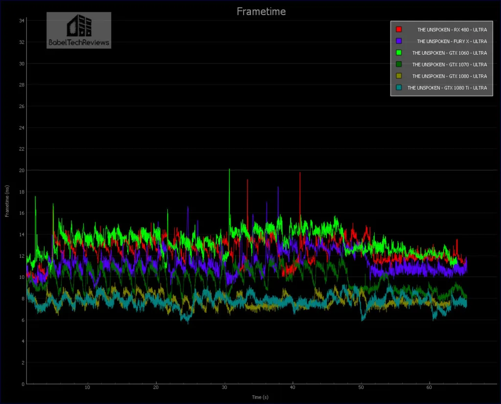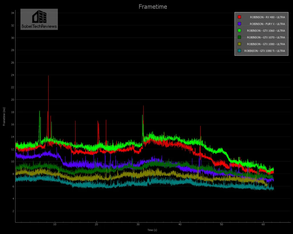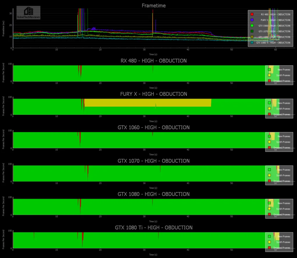 Now let’s compare the FCAT frametime chart of all six of our cards running Obduction on High settings. Although there is a noticeable drop in visual quality going from Epic to High, the VR experience is still quite impressive.