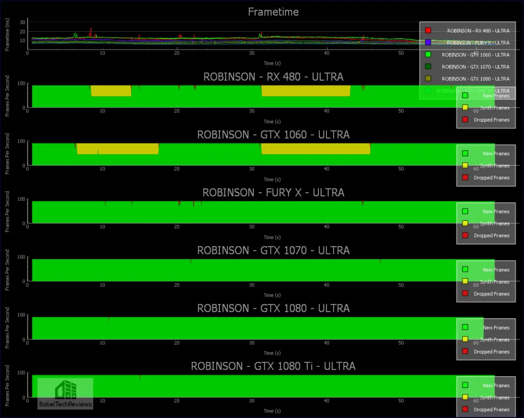 As you can see both the GTX 1080 and the GTX 1080 Ti can easily run the game on maxed out settings and the GTX 1070 also can stay out of reprojection without dropping frames. However, the Fury X goes into reprojection for almost one-third of the run, and the GTX 1060 and the RX 480 mostly reproject frames with some dropped frames besides. We would recommend dropping settings for the RX 480 and for the GTX 1060.