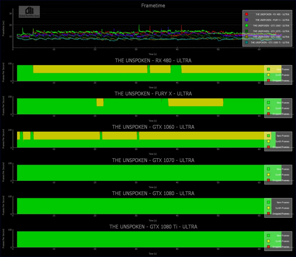 Here are the frametimes of all 6 video cards: