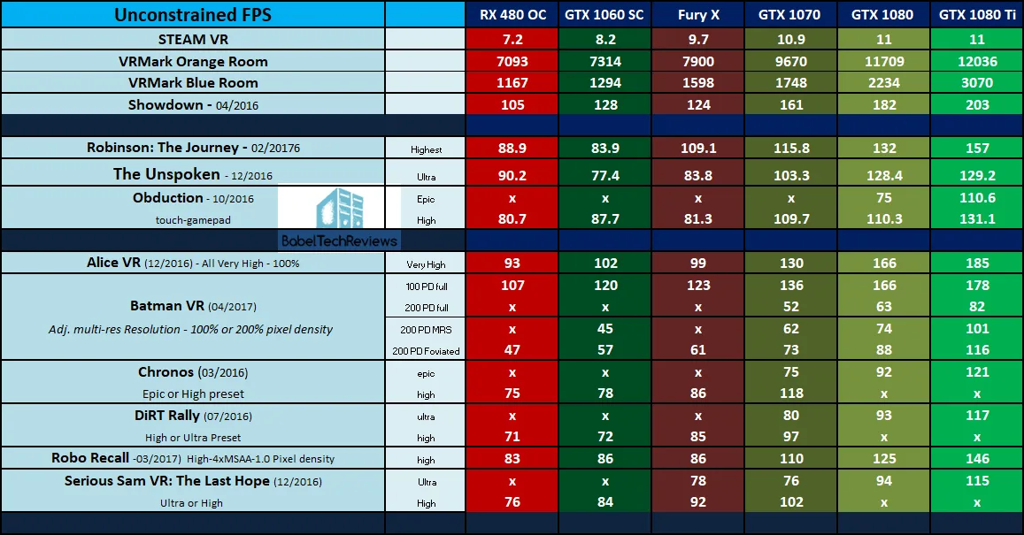 The GTX 1080 Ti and the GTX 1080 can easily increase the resolution scale or the pixel density to add to the immersion by sharpening up the visuals and decreasing the screendoor effect. Both the GTX 1070 and the Fury X can run easily with the highest settings although there are some dropped frames. Both the GTX 1060 and the RX 480 probably need to drop settings although they actually deliver a satisfactory experience with some reprojection even on the highest settings.