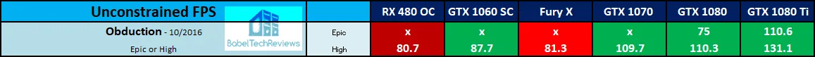 The Fury X really struggles with Obduction on High settings and our overclocked RX 480 at RX 580 clocks provides a better VR experience. We would suggest playing Obduction on Epic setting with a GTX 1080 Ti and maybe with a GTX 1080. Certainly the GTX 1080 and 1070 can provide reasonably smooth framerates on High. On the other hand a GTX 1060 and RX 480 can manage a mix of High and Medium settings, while Fury X settings need to be dialed down a bit more.