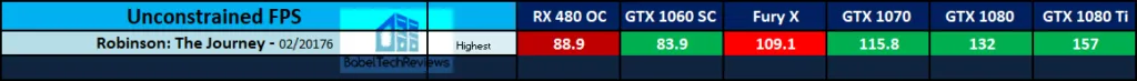 For each of our 6 test video cards, we will use Obduction to compare NVIDIA’s FCAT-generated frametime graphs and performance results directly with the Oculus Performance DeBug tool overlay running in real time in our videos. We will also benchmark Robinson: The Journey and The Unspoken using the GTX 1080 Ti FE, the GTX 1080 FE, the GTX 1070 FE, a EVGA GTX 1060 SC, the Fury X, and a Gigabyte G1-RX 480 at RX 580 clocks with our Core i7-6700K at 4.0GHz where all 4 cores turbo to 4.6GHz, an ASRock Z7170 motherboard and 16GB of Kingston HyperX DDR4 at 3333MHz.