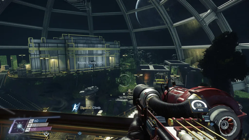 One of the stand-out weapons is the Gloo Cannon. It can help sticky and stop enemy NPCs by holding them in place temporarily, or it can stick to anything but glass to allow the player to climb to areas that would otherwise be completely inaccessible – as in the image below. Note the gobs of white Gloo that have allowed the player to climb to the shuttle.