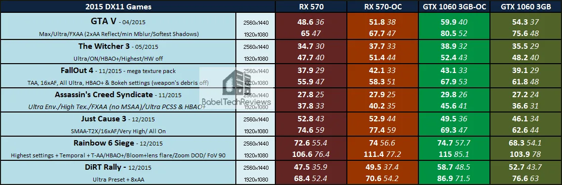 The $189 stock-clocked EVGA GTX 1060 3GB is overall slower than the stock $189 PowerColor Red Devil RX 570 with the RX 570 winning nearly two-thirds of the overall 52 game benchmarks (30 wins for the RX 570, 21 wins for the GTX 1060 3GB, 1 tie), but overclocking them both makes a real difference to the performance results.