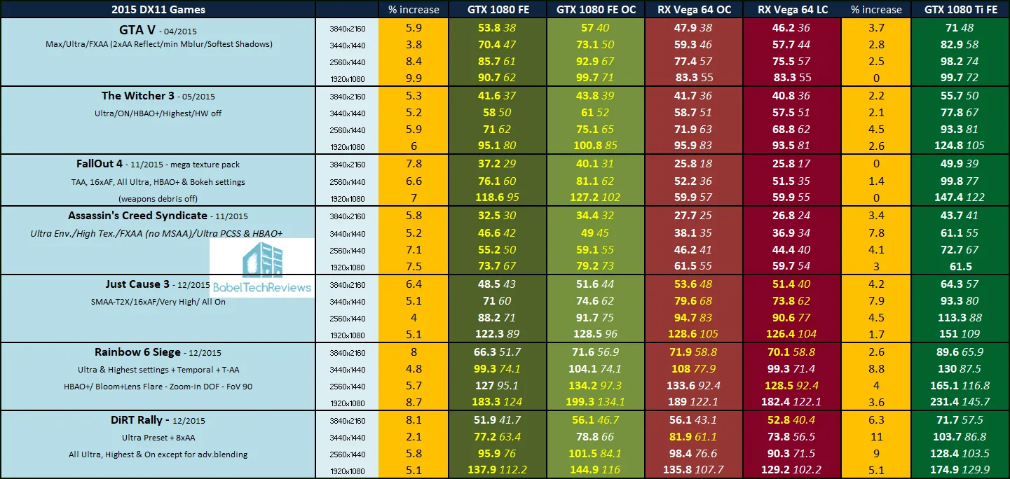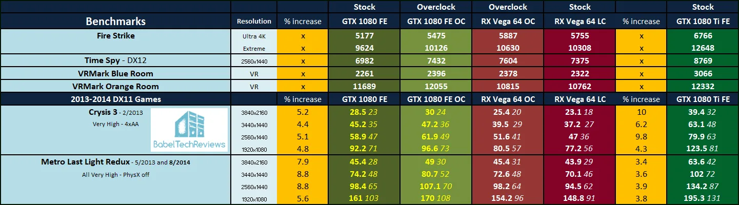The GTX 1080 stock results are presented in the first (dark green) performance results column next to the second (lighter green) GTX 1080 overclocked results; the overclocked RX Vega 64 LC results are in the first (lighter red) column, and the next (darker red) column represents the stock RX Vega 64 results. The first yellow column represents the percentage performance increases of the overclocked GTX 1080 over stock, and the last yellow column represents the performance percentage increase of the overclocked RX Vega 64 over its stock-clocked results. Finally the stock GTX 1080 Ti is shown in the last column for comparison. Yellow numbers show “wins” between the GTX 1080 and the RX Vega 64.