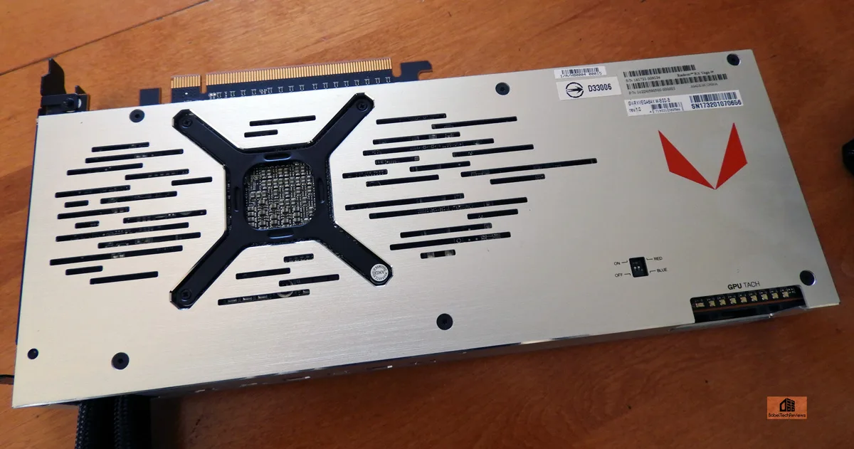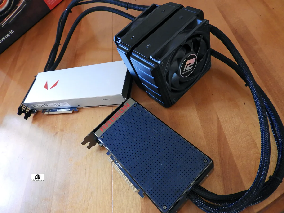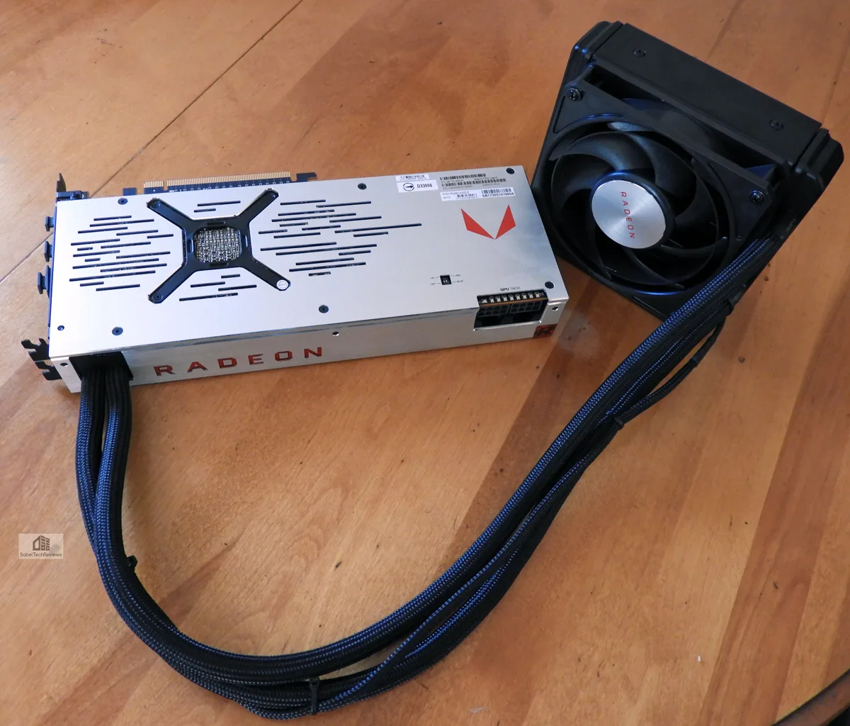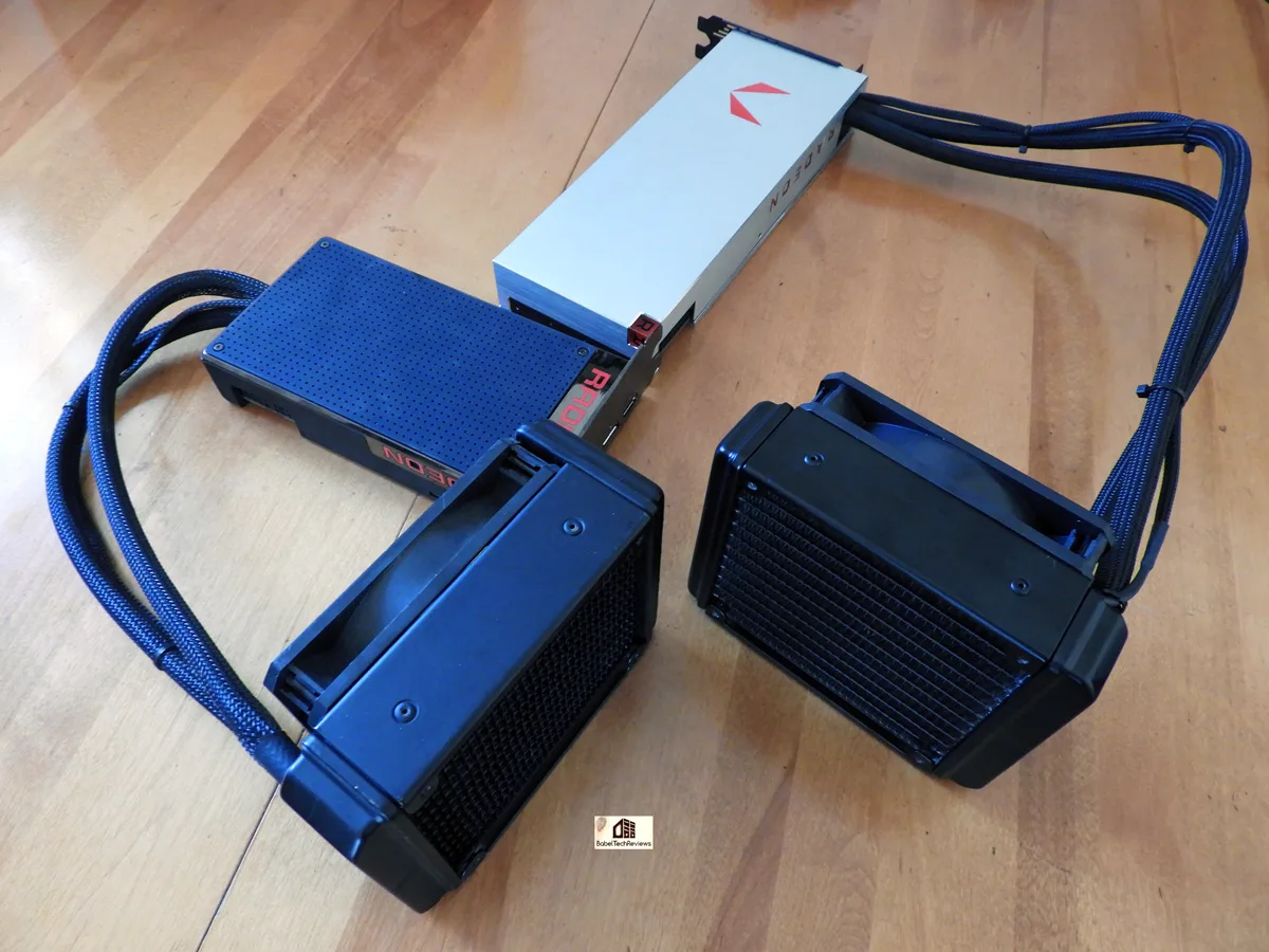 Here is the Fury X pictured with its radiator side by side with the Vega’s cooler. They are the same size.