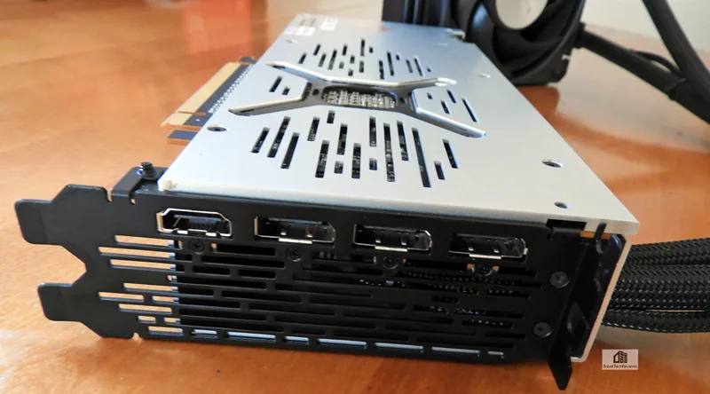 The Radeon RX Vega 64 Liquid Edition is styled very well with an aluminum case. The radiator is 120mm and it is connected to the pump inside the card by braided cables.