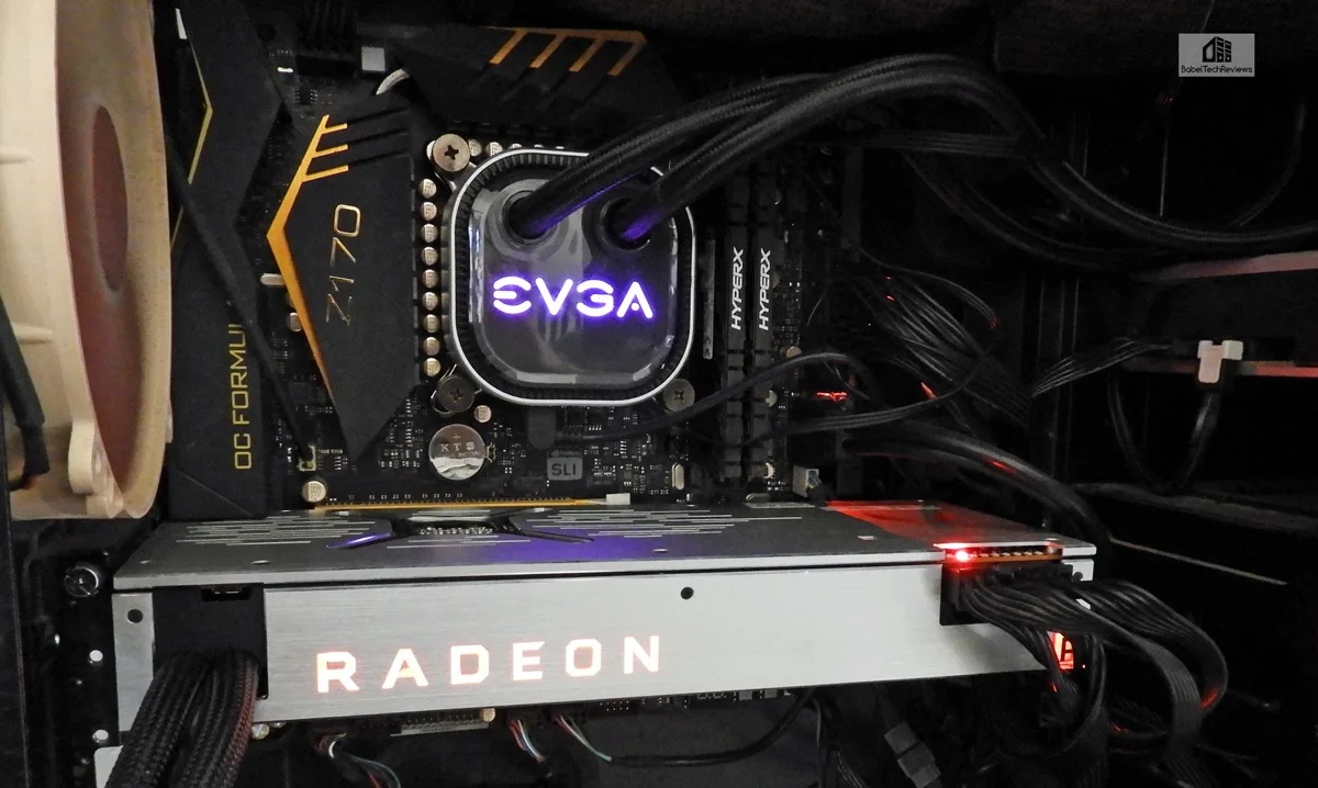 The Radeon Logo lights up and is a perfect counter to NVIDIA’s lighted GeForce. AMD certainly has got a premium looking card with the Liquid cooled RX Vega 64. Let’s check out its performance after we look over our test configuration on the next page.