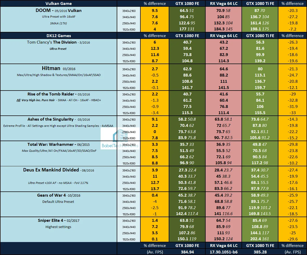The GTX 1080’s results are in the first performance results column (in white) and the RX Vega 64 LC results are shown in the second performance results column (in black). The 3rd performance results column represents the GTX 1080 Ti results in white. The first and the last performance differences columns in yellow show the percentage differences between the RX Vega 64 Liquid edition and the other two video cards.