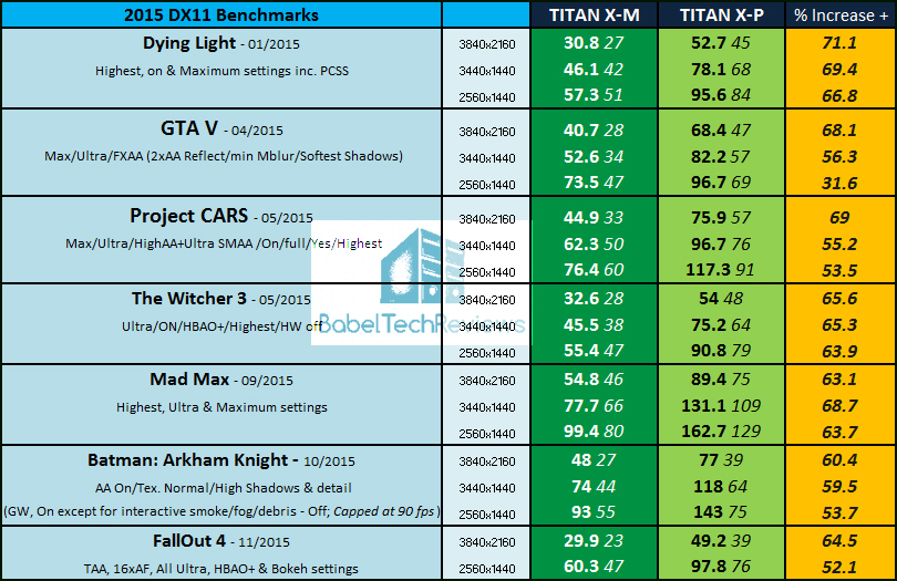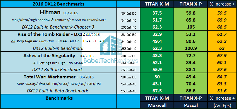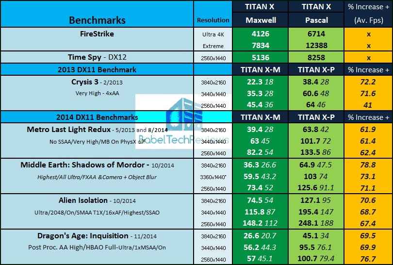 All results, except for FireStrike and Time Spy, show average framerates and higher is always better. Minimum frame rates are shown next to the averages when they are available, but they are in italics and in a slightly smaller font. In-game settings are fully maxed out and they are identically high or ultra across all platforms. The Maxwell TITAN X performance results are in the first column (in white) and the Pascal TITAN X results are shown in the second column (in black). The 3rd column shows the percentage increase of Pascal over Maxwell.