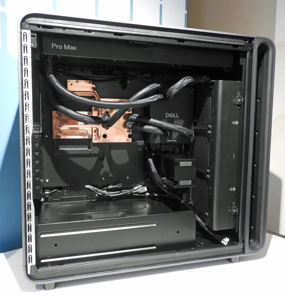 The Dell Pro Max with GB300 shown above, will be an ultra high-end workstation which was displayed but not announced nor is available yet. It will feature the NVIDIA GB300 Grace Blackwell Ultra Desktop Superchip, 496GB LPDDR5X CPU memory, and 288GB HBM3e memory from Blackwell Pro GPUs. It supports up to 1 trillion parameter models, delivering 20 Petaflops of FP4 computing power using the NVIDIA DGXTM OS on Linux & NVIDIA AI Enterprise software stack.