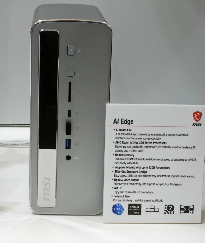 The compact MSI AI Edge uses AMD’s Strix Halo to run up to 120 billion parameter LLMs using its shared memory of 128GB to assign up to 96GB to the GPU.