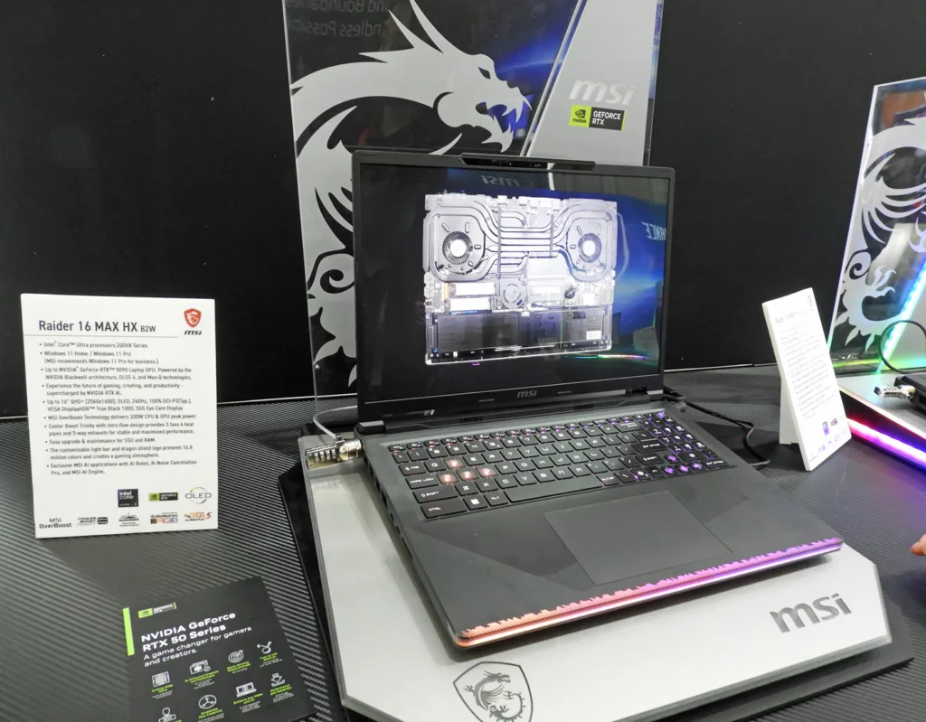 This is the latest Intel powered 16-inch 1440P 265Hz version of the flagship AMD 16 core 4K 18″ MSI Raider A18 HX A9WJG-052US that we reviewed. It also has a mobile RTX 5090 within a 300 W total power envelope with three fans and six heatpipes cool it.