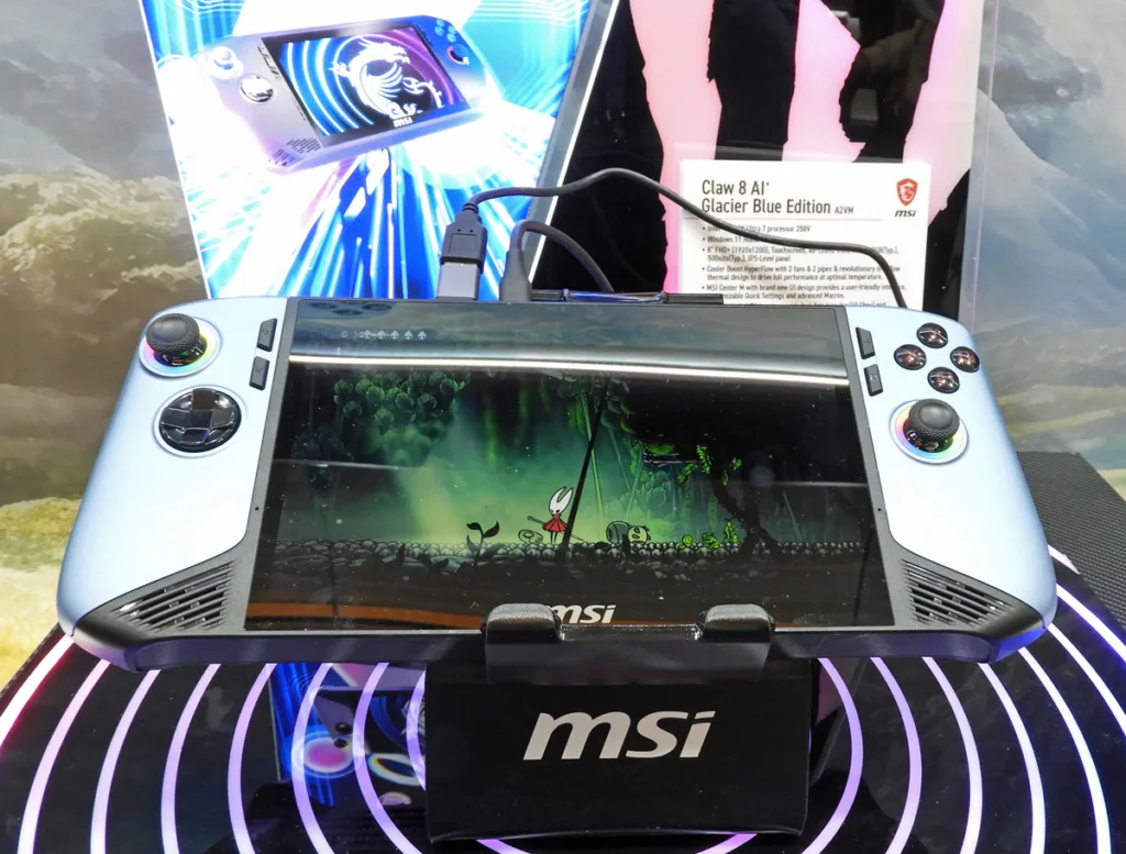 We really liked the MSI Claw 8 AI+ in the new Glacier Blue color. It features an 8-inch 1080P touchscreen IPS display, an Intel Core Ultra 7 258V with integrated Intel Arc 140V graphics, 32GB RAM, and a 1TB SSD.