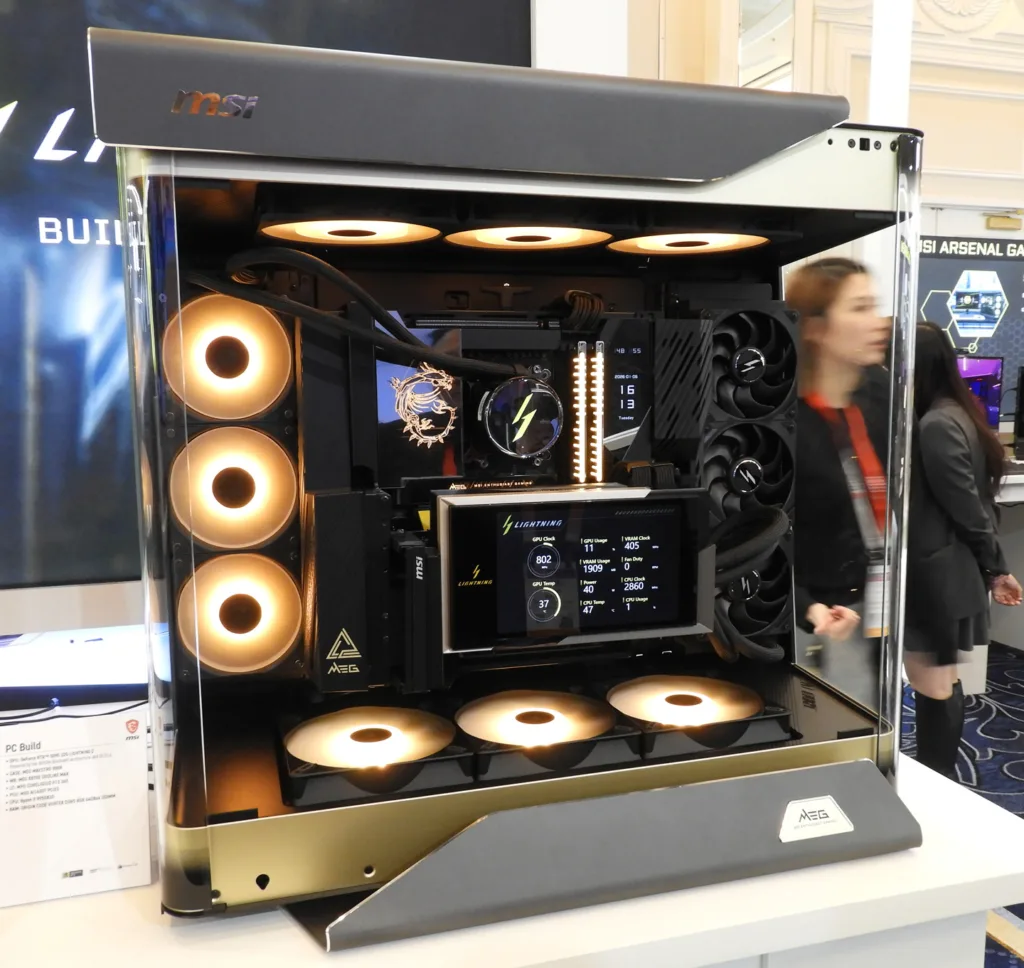 We could not help but be impressed by the new RTX 5090 Lightning Z. It features the world’s first 8-Inch GPU Display, the first GPU to reach 1000W, and the first full-copper, full-cover cold plate for extreme overclockers. There will only be 1,300 produced, each selling for nearly $5,100.