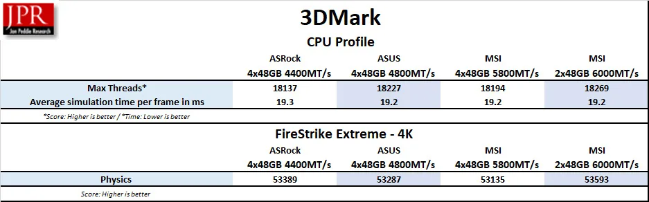 3DMark uses a specialized CPU profile test that uses from one to the maximum number of CPU threads available to give the average simulation time per thread. Here is the summary chart using max threads, followed by the Firestrike Extreme 4K Physics scores, which also depend heavily on CPU/RAM.