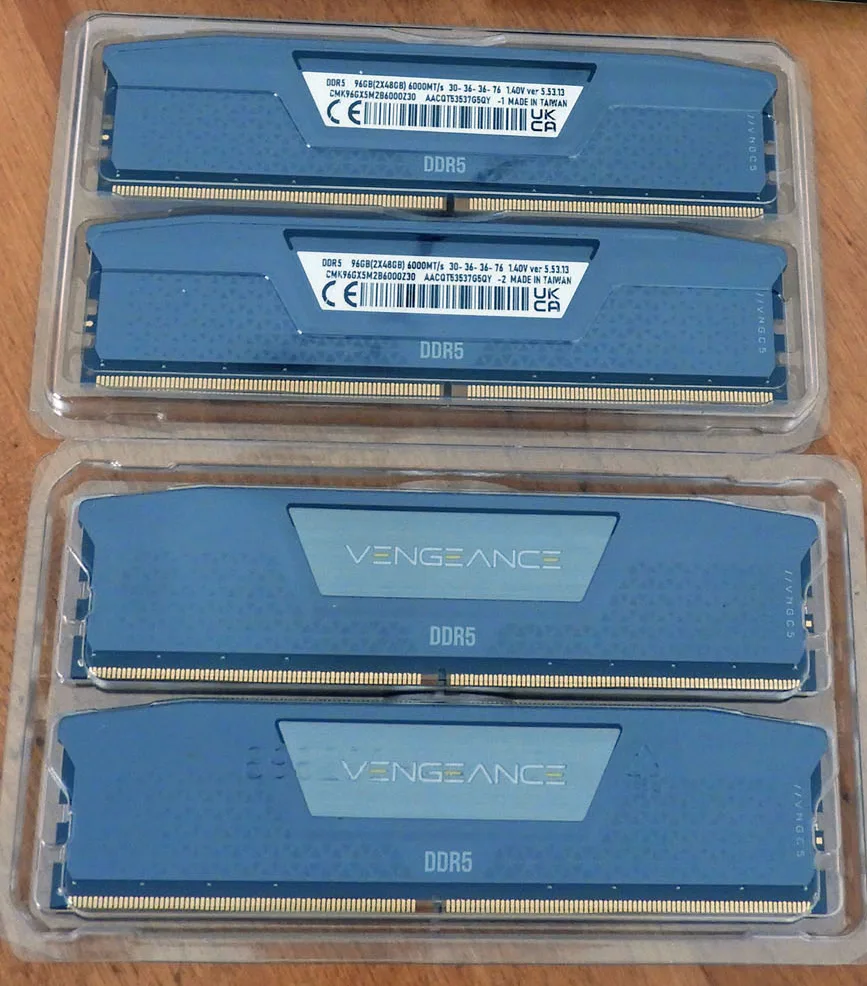 We asked CORSAIR for a 2x48GB DDR5 6000MHz CL30 VENGEANCE kit to give our 9950X3D/RTX5090 PC additional memory for creative and AI tasks. Instead, we received two 2x48GB kits for a total of 192GB RAM, which we reviewed here. Unfortunately, our ASRock X870E Taichi motherboard was only able to manage a very disappointing 4400MHz (MT/s) with both kits installed.