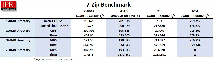 The 7-Zip built-in benchmark we use is a synthetic benchmark that tests LZMA and LZMA2 algorithms compression/decompression and gives a rating in GIPS (giga or billion instructions per second), which is calculated from the measured speed. It is somewhat dependent on RAM speeds.