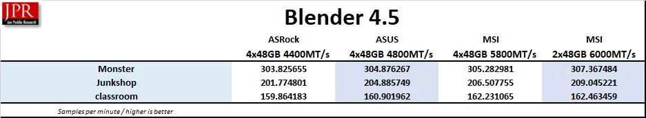 We generally see performance increase with faster CPU and memory speeds, so we used the very latest version of the Blender 4.5.0 benchmark, which primarily measures CPU performance in rendering production files. Higher is better, as the benchmark automatically renders a scene multiple times and gives the results as samples per minute. The benchmark may be downloaded from here.