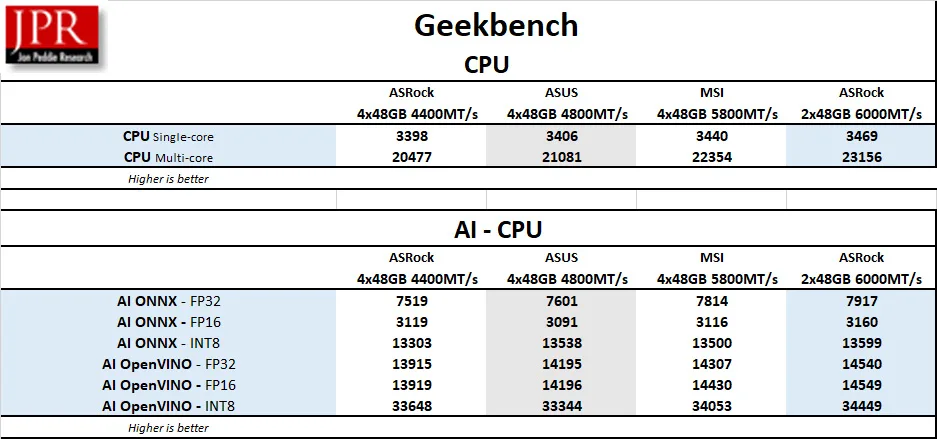 GeekBench 6 is a well-established CPU benchmarking program that runs a series of tests and times how long the processor takes to complete the tasks. Faster memory means the CPU may be able to complete tasks faster.