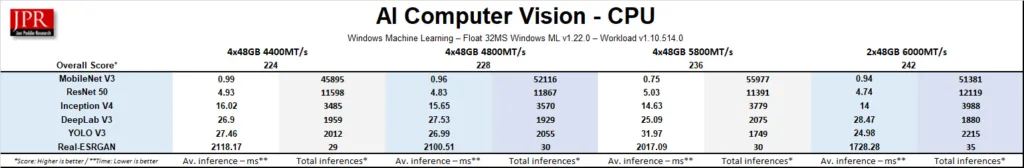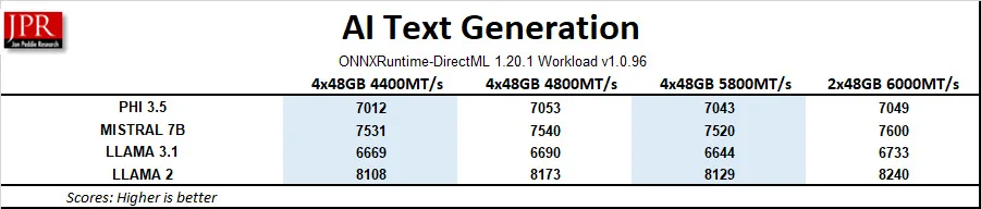 We saw the much higher latency of the 4x48GB’s 4400MT/s configuration causing the inference times to increase significantly, resulting in lower total inferences compared with the 2x48GB 6000MT/s configuration.