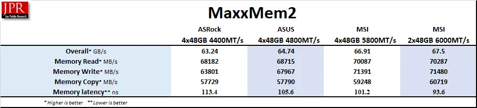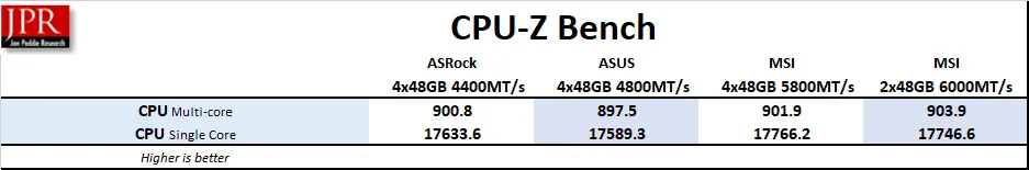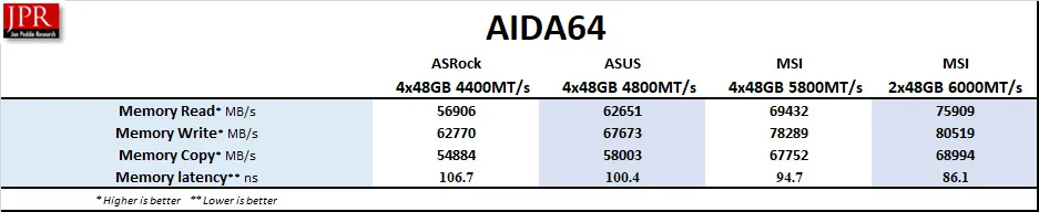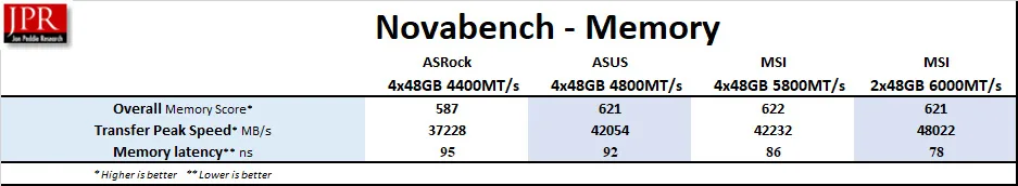 So let’s compare 4x48GB performance – at 4400MT/s, 4800MT/s, and 5800MT/s – among our three motherboards and also against 2x48GB at 6000MT/s, each at CL30-36-36-76.