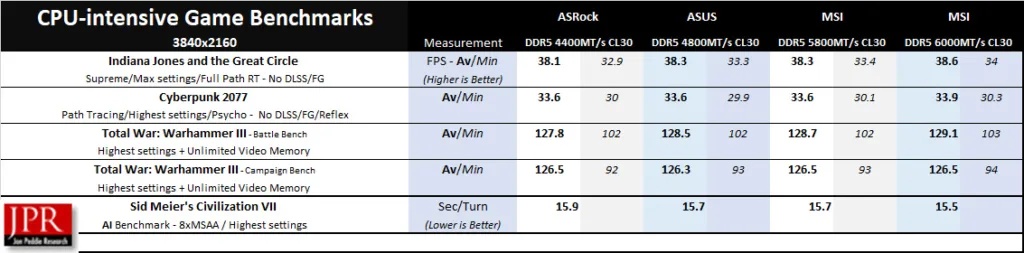 The four memory speeds each ran the above games relatively closely in performance. Even the VENGEANCE 4x48GB kit at only 4400MT/s does reasonably well, which means — although not ideal — a 192GB workstation-type setup can work for gaming.