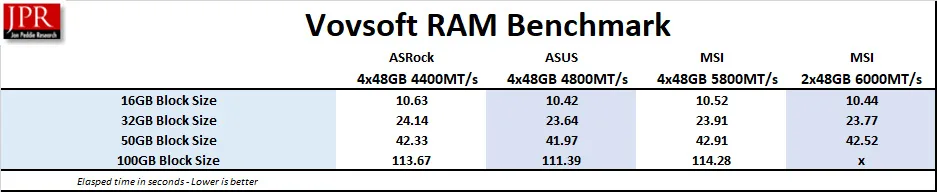 Vovsoft RAM Benchmark is another free semi-synthetic benchmark that mimics the way real applications use large amounts of RAM by allowing users to customize the block size. An ‘x’ means the block is too large to be run by the memory kit.