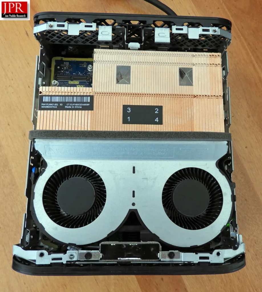 Two 40 mm squirrel-cage fans direct airflow through a copper heatsink atop a vapor-chamber cooling system. Under normal loads, the Z2 Mini G1a operates nearly silently, although at full load, the fans are audible across a room. By default, the system runs in maximum performance mode, but fan RPM can be manually tuned down for quieter operation with minimal performance loss.