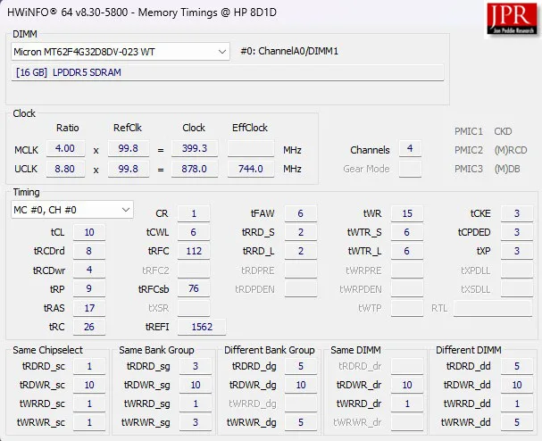 The memory clock speed registers correctly at 4000 MHz, and as it’s DDR (Double Data Rate), data transfers occur twice per clock cycle—yielding an effective rate of 8000 MT/s (megatransfers per second). The installed ECC LPDDR5X memory maintains strong bandwidth with modest latency, as shown below.