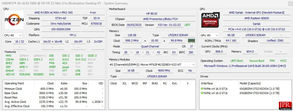 Processor: | AMD Ryzen AI Max+ PRO 395 (Zen 5, 120 W, 3.0/5.1 GHz base/boost, 64 MB L3 cache, 16 cores / 32 threads) |
