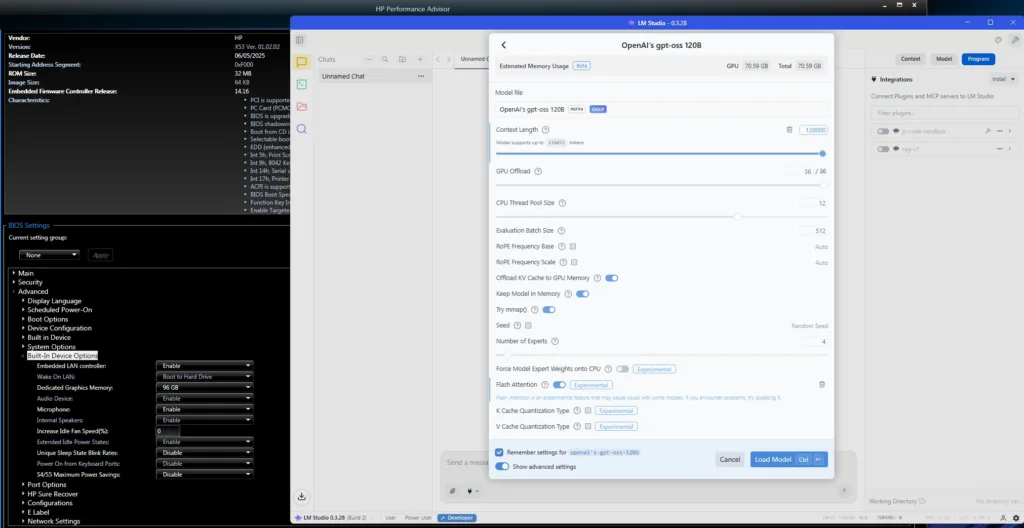 One other issue is that LM studio configures its models for a default 4096 token context window as the amount of data it can use while generating responses. We ran out of context after about three to five prompts in conversations with the AI. GPT-OSS 120B actually supports a massive 131,072 token context window. We were able to use a 128,000 token window by configuring as shown below by selecting “manually load advanced settings”, “show advanced settings”, and turning on “Flash Attention”.