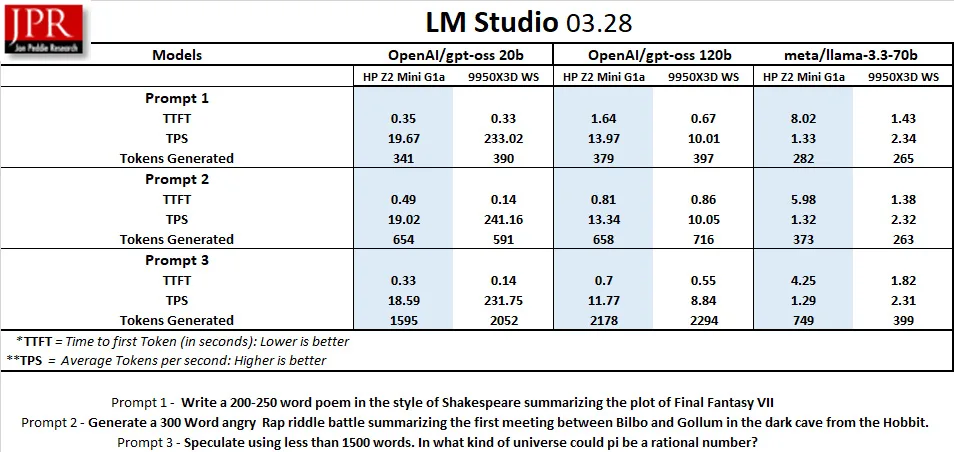 When moving to the 120B model, the Z2 Mini G1a was faster than the RTX 5090 desktop. We still consider 10 tokens per second acceptable, especially for advanced math formulas with complex toy universe-building responses generated by our third prompt. But both PCs were very slow generating responses using the Meta Llama 3.3 70B model, as 1-2 tokens per second is just painful.