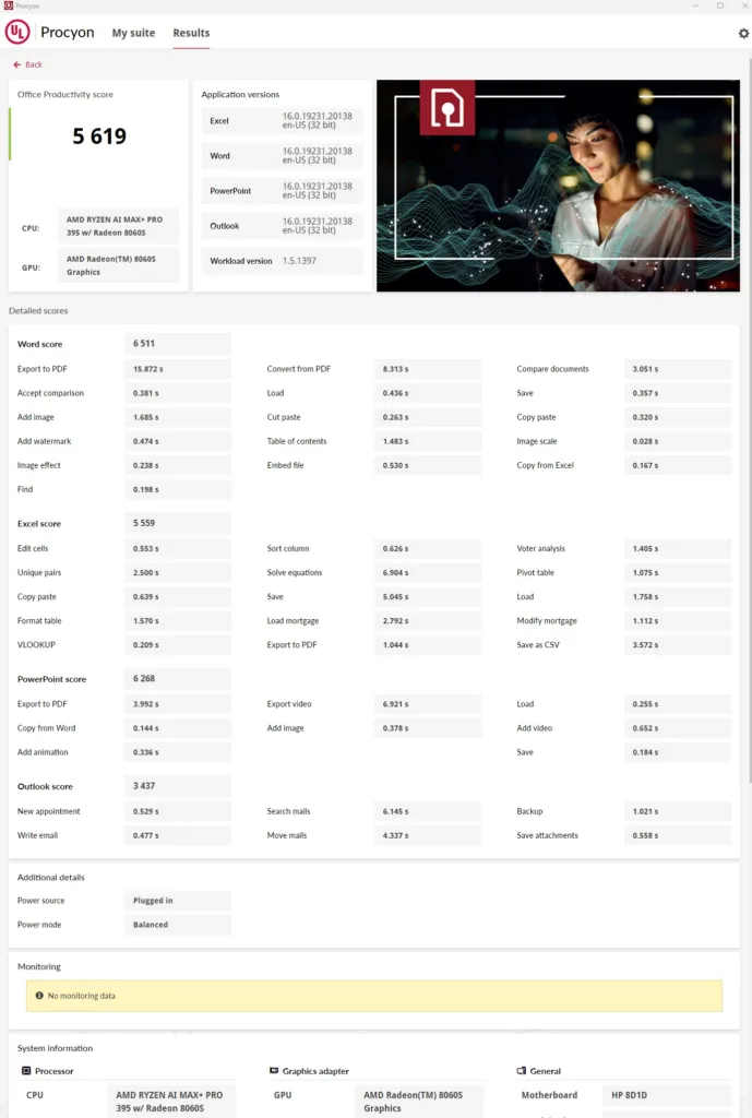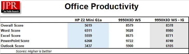 The Procyon Office suite evaluates performance in Microsoft Word, Excel, PowerPoint, and Outlook. The Z2 Mini G1a delivered detailed, consistent results across these productivity tasks.