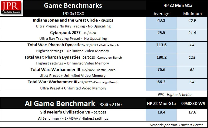 Although gaming is not the Z2 Mini G1a’s primary focus, we benchmarked five modern, CPU- and GPU-intensive titles alongside two synthetic 3DMark tests to illustrate its performance capabilities. All tests were run at 1920×1080, except for the Civilization VII AI benchmark at 3040×2160 to compare average turn times against the RTX 5090-equipped PC.