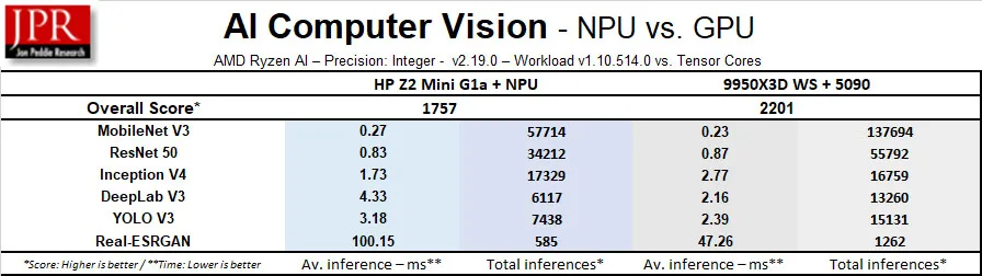 Performance results were mixed—each system excelled in different inference workloads. We then compared the Z2 Mini G1a’s Ryzen AI NPU (50 TOPS) against the RTX 5090’s Tensor Cores, representing distinct AI acceleration architectures.