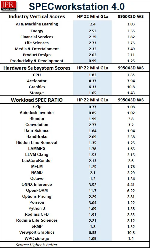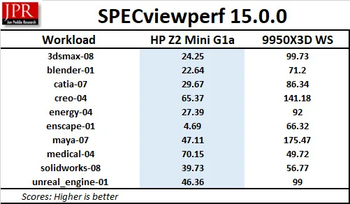 In all but three subtests, the Z2 Mini G1a outperformed the official SPEC reference workstation, affirming its true workstation-class capability. It also came remarkably close to the desktop’s scores — and even outperformed it in categories such as Hidden Line Removal, LAMMPS, OpenFOAM, Rodinia Life Sciences, SRMP, and Poisson.