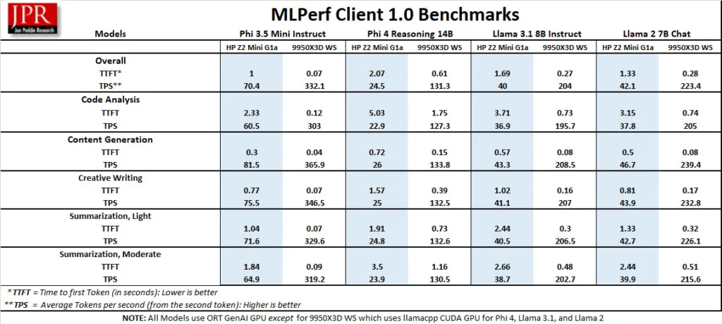 - MLPerf Client 1.0 – Phi 3.5 Mini Instruct / Phi 4 Reasoning 14B / Llama 3.1 8B Instruct / Llama 2 7B Chat