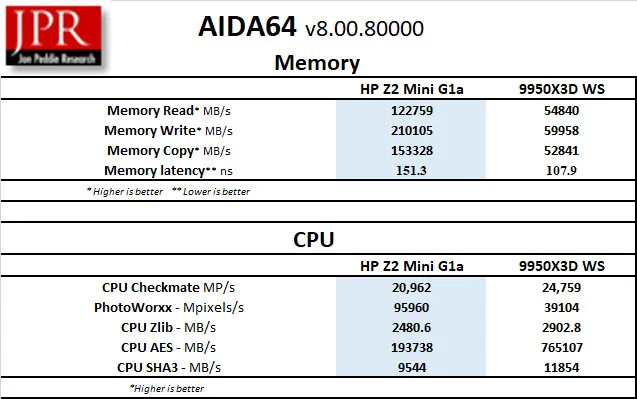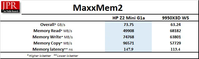 The chart below compares Z2 Mini G1a results with the full-sized destop, emphasizing CPU benchmarks sensitive to memory speed and latency.