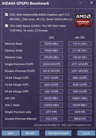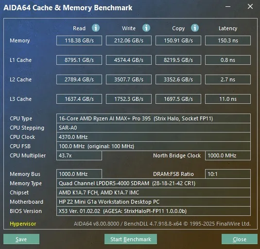 The Z2 Mini G1a’s LPDDR5X-8000 ECC memory delivers exceptional bandwidth, significantly outperforming the desktop’s DDR5 4200 kit. Although its latency is higher, the Ryzen AI Max+ PRO 395 consistently trades blows with the Ryzen 9 9950X3D, even leading in several tests.
